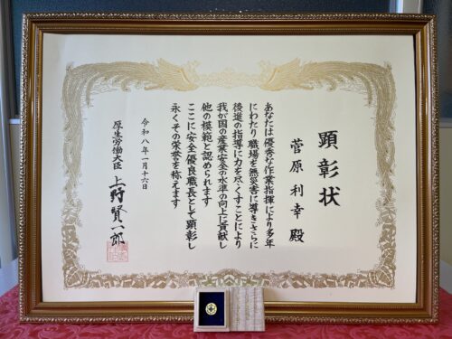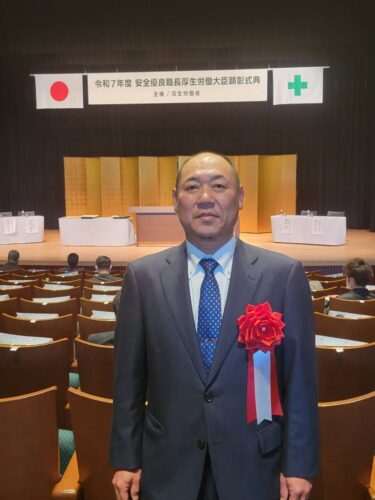 令和8年1月16日 東京『イイノホール』にて【令和7年度 安全優良職長厚生労働大臣顕彰式典】が開催され顕彰状を授与されました。 長年の経験と実績を基に、職長として労働災害発生防止に努めてきた最大の評価をいただき、光栄に思います。